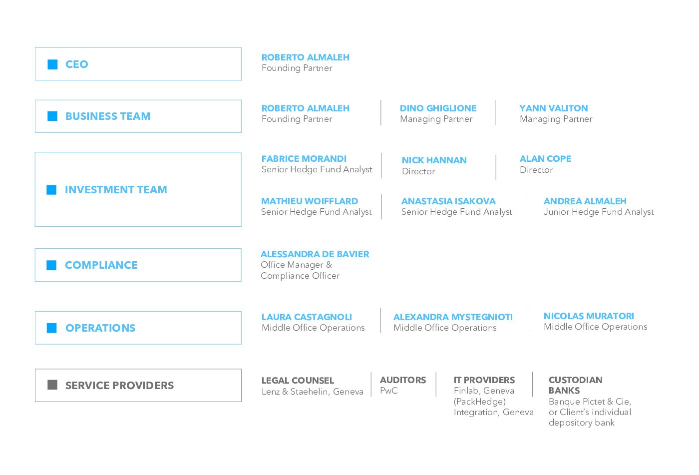 - The team is led by Roberto Almaleh who was a Partner at Banque Syz and managed a Hedge Fund platform of USD 8 billion